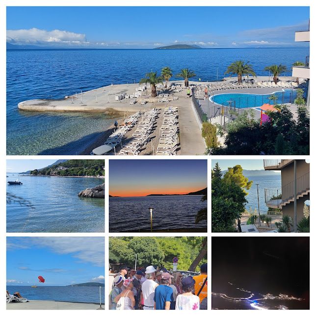 le premier jour de ma chambre je découvre l'Adriatique la péninsule de Peljesac et l'île de Hvar avant d'aller à la découverte du complexe hôtelier: ses plages,piscines et ses animations. l'après midi même nous partons en groupe serré à la découverte du village voisin par la petite route qui longe la côte, les plages et les trottoirs sont encombrés de transats et baigneurs , les Croates profitent du dernier week end avant la reprise des écoles.